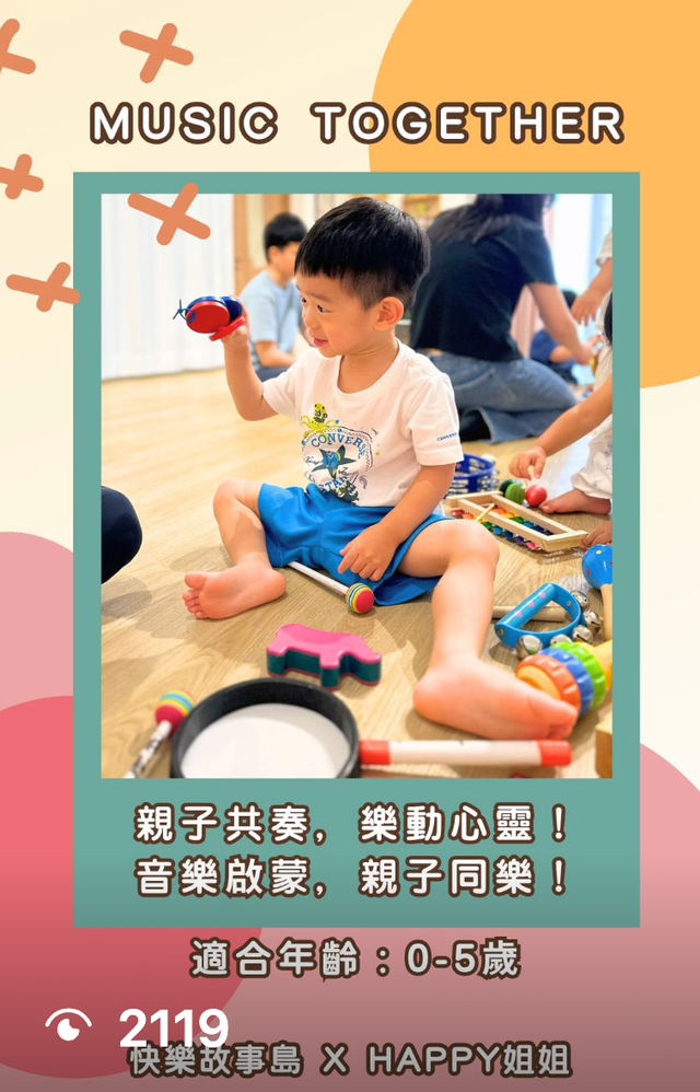 這是一堂從出生就能參加的課程,透過音樂和各種樂器,引導孩子自由唱跳、互動,搭配教材和親子遊戲,讓學習變得像玩樂一樣開心。我們不限制孩子的上課方式,重點是讓他們在45分鐘內,透過唱歌、跳舞、聆聽、模仿和互動,獲得適當的刺激,享受學習的樂趣。如果您還在找適合孩子的課程,這堂課會是很好的選擇,陪孩子快樂學習、持續成長。